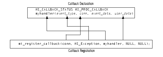 When you register a callback with the mi_register_callback() function, you provide arguments for most parameters of the callback. Figure 10-4 shows how a call to mi_register_callback() provides the arguments that initialize the parameters of the myhandler() callback.