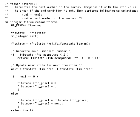 Figure 13-3 implements an iterator-value-return function, called fibGen_retone(), which the fibGen() iterator function (Figure 13-1 on page 13-6) calls each time it obtains the SET_RETONE iterator status.