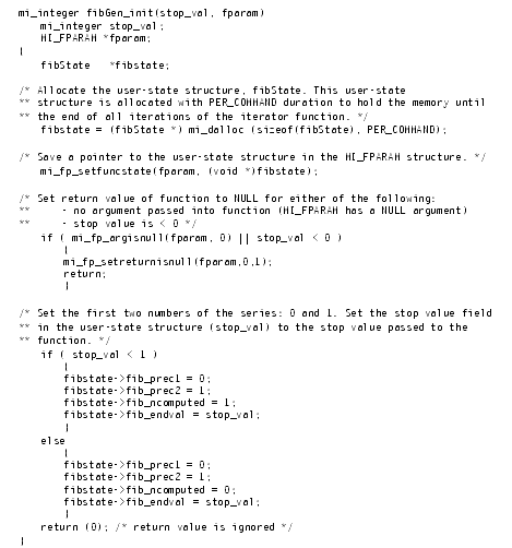 Figure 13-2 implements an iterator-initialization function, call fibGen_init(), which the fibGen() iterator function (Figure 13-1 on page 13-6) calls when it obtains the SET_INIT iterator-status value.
