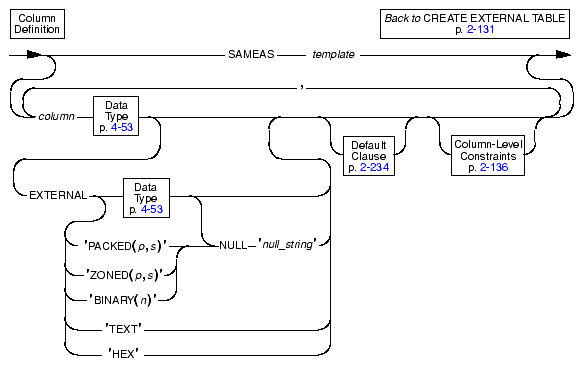 When you create a table with the SAMEAS keyword, the column names from the original table are used in the new table. You cannot use indexes in the external table definition.