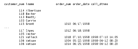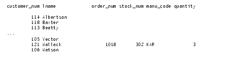 Query 5-16 first performs a simple join on the orders and items tables, retrieving information on all orders for items with a manu_code of KAR or SHM. It then performs an outer join to combine this information with data from the dominant customer table. An optional ORDER BY clause reorganizes the data into the form that Query Result 5-16 shows.