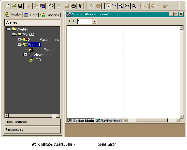 panel of the World Manager. In addition, the Scene Editor is displayed so that you can begin to design your scene by inserting layouts and other graphic objects.