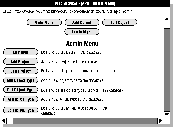 Admin Menu Edit or delete a user account. Add, edit, or delete a project. Add a new MIME type. Add a new object type.