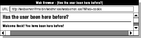 <HTML> <HEAD><TITLE>Has the user been here before?</TITLE></HEAD> <BODY> <H2>Has the user been here before?</H2><HR> <!--- See if the flag variable has been set ---> <?MIBLOCK COND=$(XST,$flag)> <!--- Flag variable has been set ---> <B>Welcome Back! You have been here before!</B> <?/MIBLOCK> <?MIBLOCK COND=$(NXST,$flag)> <!--- Flag variable has NOT been set ---> <!--- Set a cookie ---> <?MIVAR>$(HTTPHEADER,set-cookie,flag=yes)<?/MIVAR> <B>This is the first time you have been to this page!</B> <?/MIBLOCK> </BODY> </HTML>