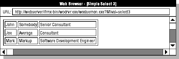 <HTML> <HEAD><TITLE>Simple Select 3</TITLE></HEAD> <BODY> <TABLE BORDER> <TR> <TD> John </TD><TD> Somebody </TD><TD> Senior Consultant </TD> </TR> <TR> <TD> Joe </TD><TD> Average </TD><TD> Consultant </TD> </TR> <TR> <TD> Mark </TD><TD> Markup </TD><TD> Software Development Engineer </TD> </TR> </TABLE> </BODY> </HTML>