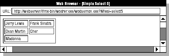<HTML> <HEAD><TITLE>Simple Select 5</TITLE></HEAD> <BODY> <TABLE BORDER> <TR> <TD> Jerry Lewis </TD><TD> Frank Sinatra </TD> </TR> <TR> <TD> Dean Martin </TD><TD> Cher </TD> </TR> <TR> <TD> Madonna </TD><TD> </TD> </TR> </TABLE> </BODY> </HTML>